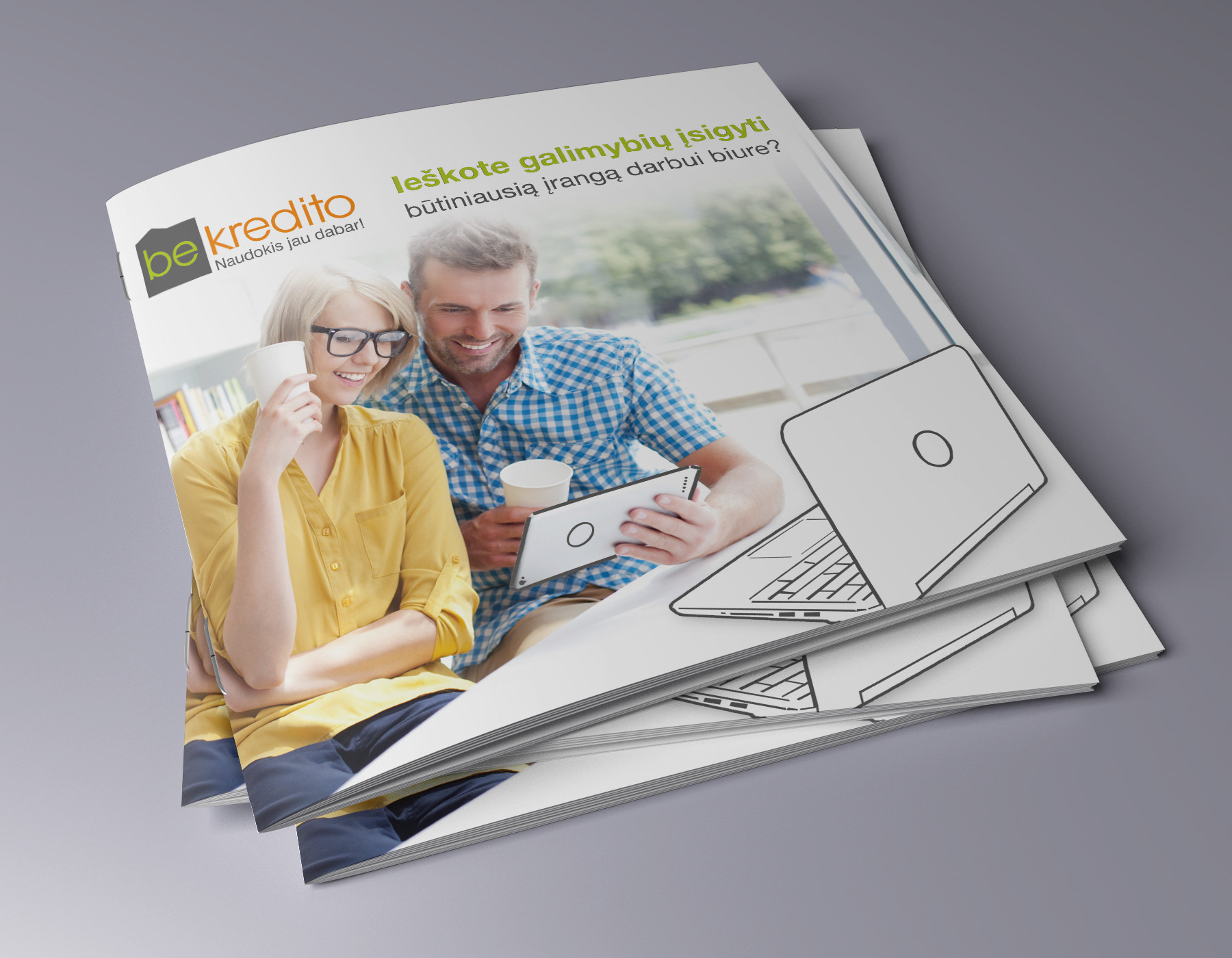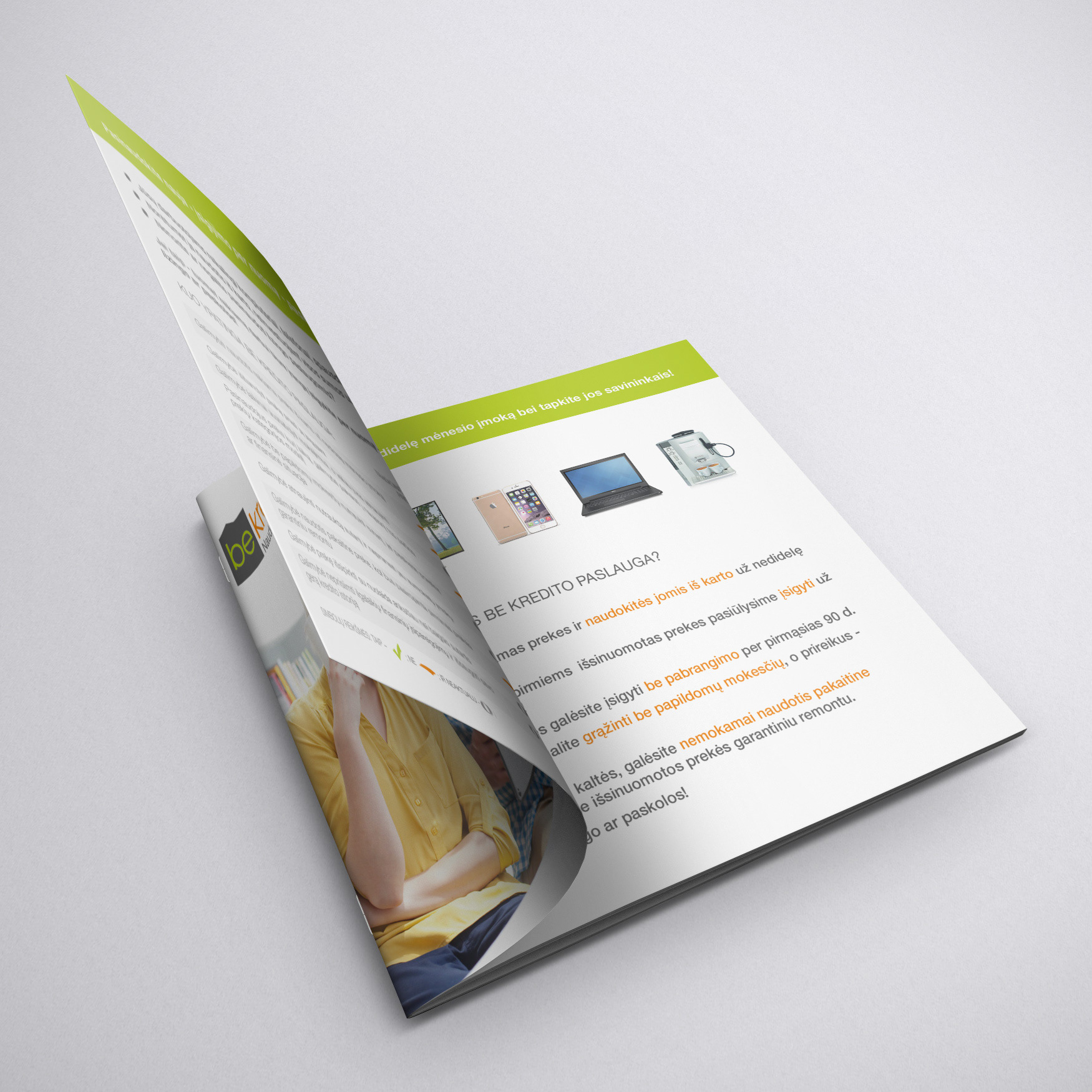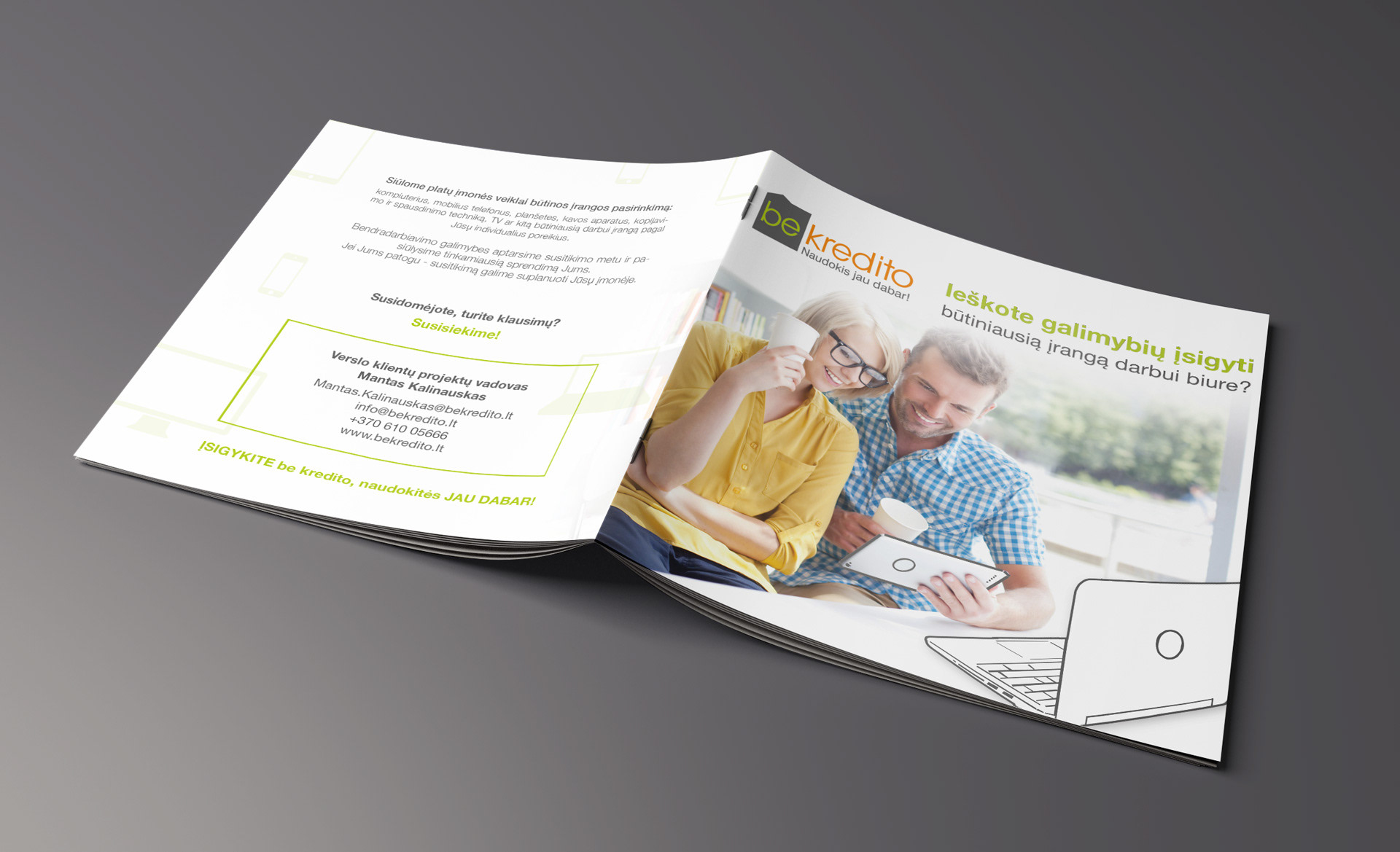 Elektroninės parduotuvės „Be kredito“ bukleto dizainas.