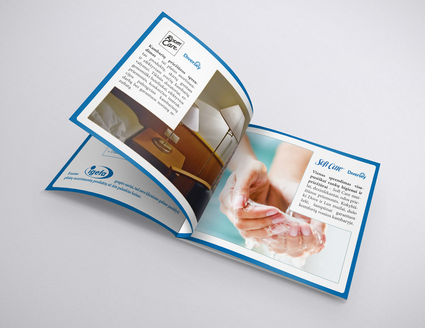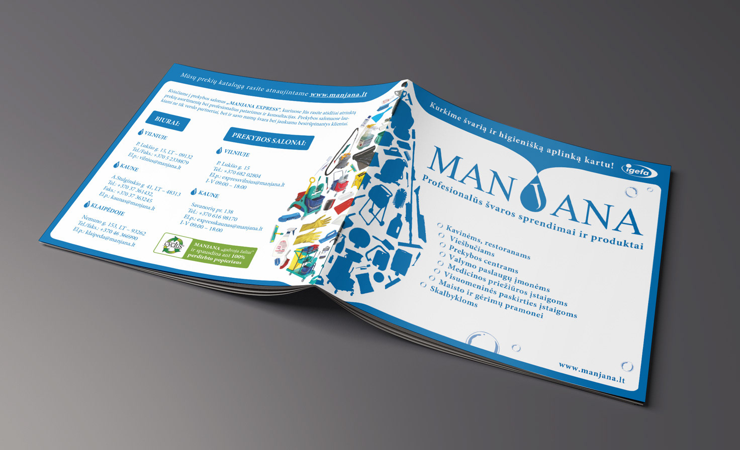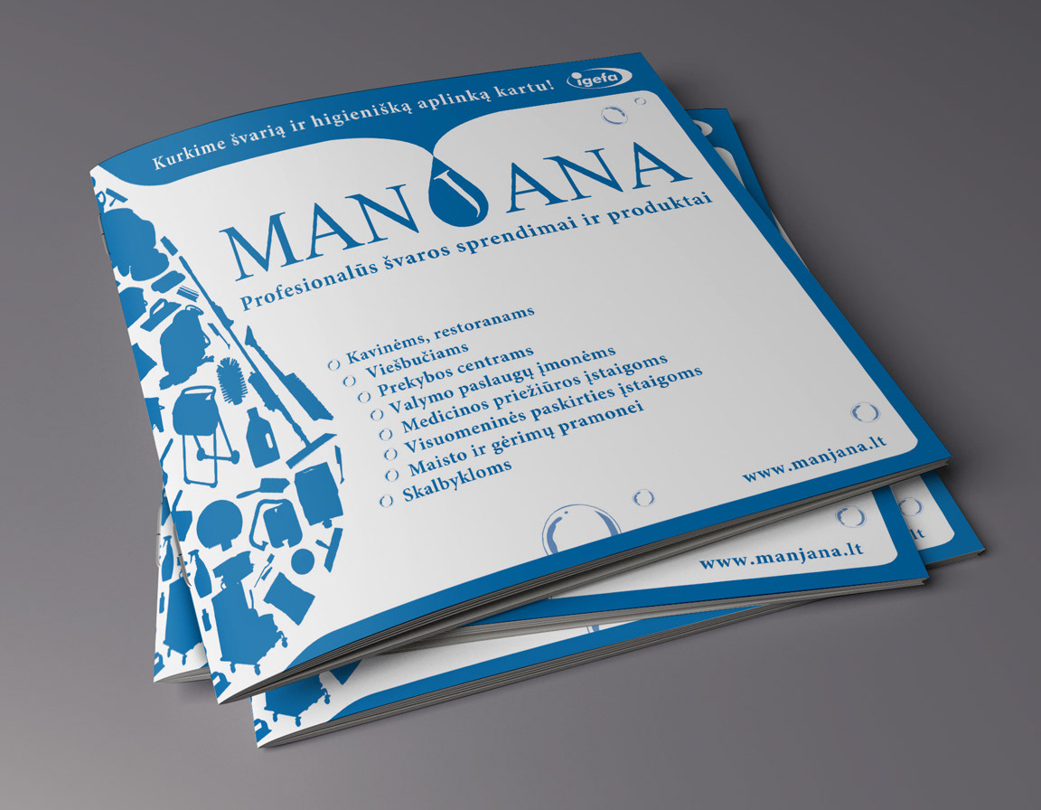 Manjana brochure design printed on 100% recycled paper. // Švaros priemonių firmos „Manjana“ bukleto dizainas ruoštas 100% perdirbam popieriui.
